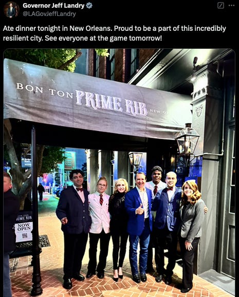 After 15 people were declared dead by New Orleans law enforcement, the Republican Governor of Louisiana rushed to social media…to post a picture of himself grinning ear-to-ear outside a high-end rib restaurant in NOLA (he’s the one giving a thumbs-up in the blue jacket).