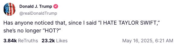 Here’s what the adjudicated rapist said this morning on Truth Social: “Has anyone noticed that, since I said “I HATE TAYLOR SWIFT,” she’s no longer ‘HOT?’”