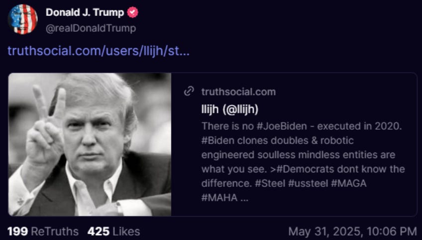 Trump posted that Joe Biden had been “executed” in 2020, and that the Biden we’ve all been seeing since then is merely a “clone.”
